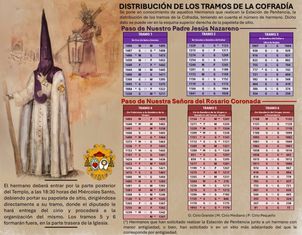 Nómina de la Cofradía para Miércoles Santo, en el siguiente archivo PDF. La nómina se encuentra ordenada según el número de Hermano.